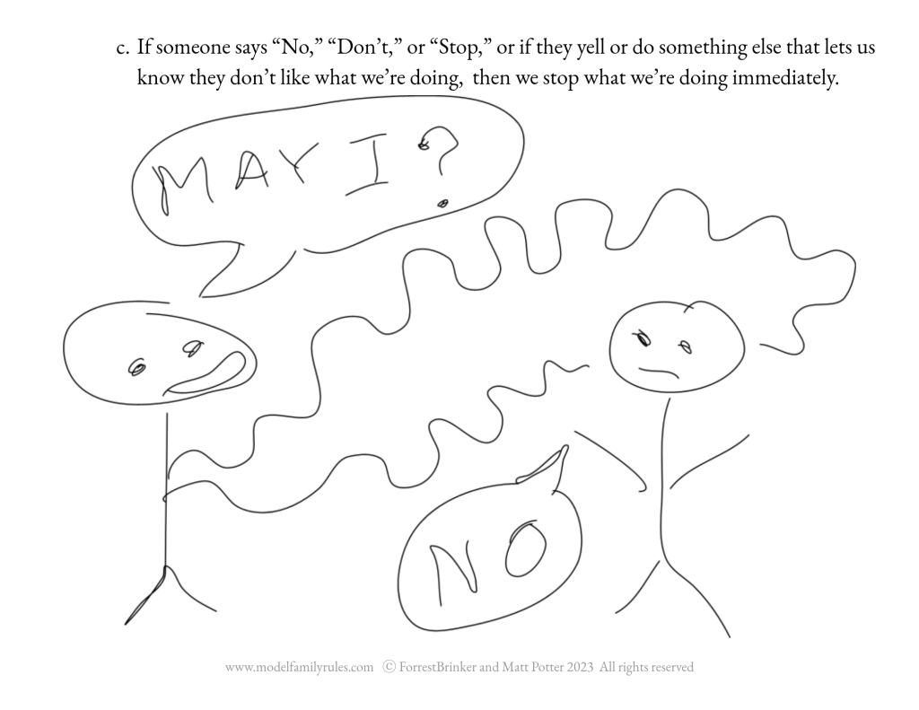 May 23, 2023June 1, 2023 by forrest Rule 3. We use consent. Part c. Illustration Model Family Rules consent, family, familyrules, rules Leave a comment If someone says “No,” “Don’t” or “Stop,” or if they yell or do something else that lets us know they don’t like what we’re doing, then we stop what we’re doing immediately.