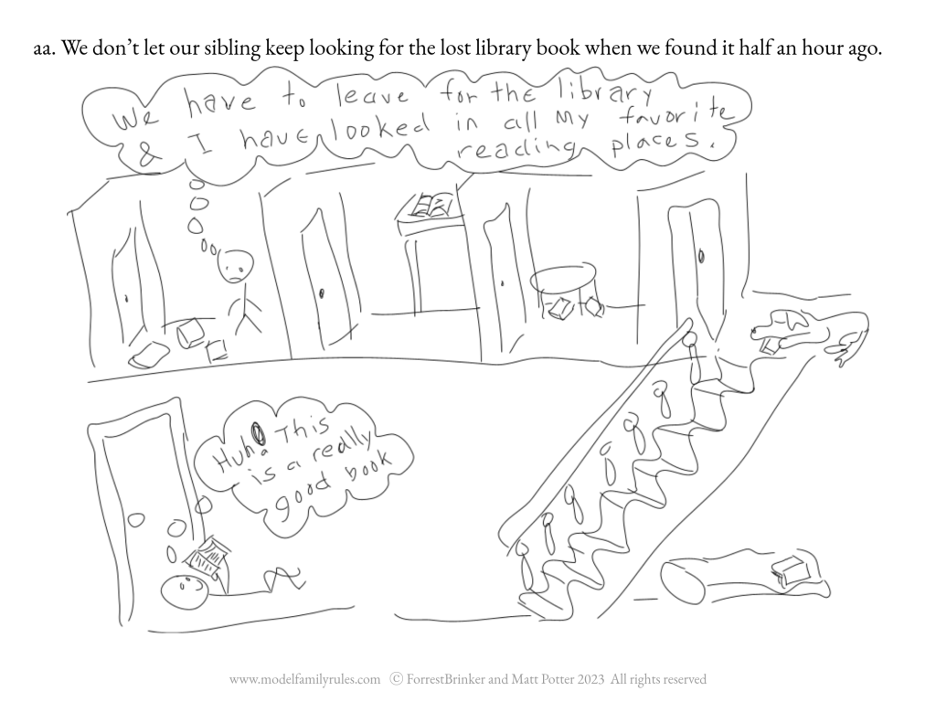 We don’t let our sibling keep looking for the lost library book when we found it half an hour ago.