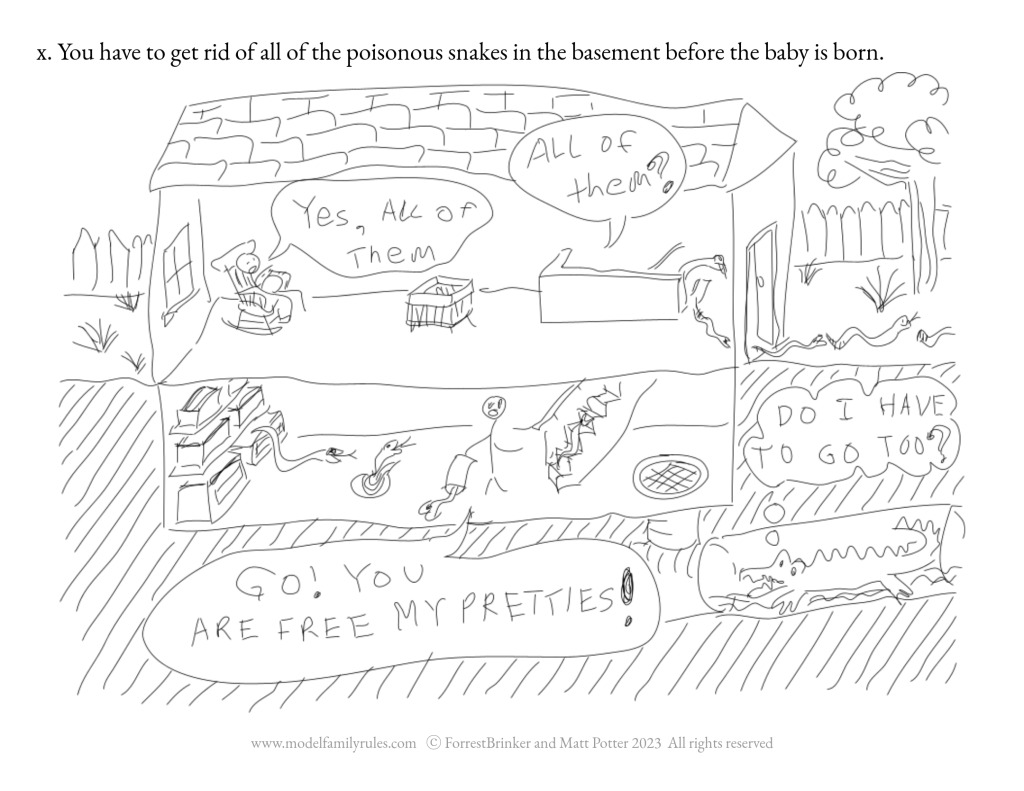 You have to get rid of all of the poisonous snakes in the basement before the baby is born.