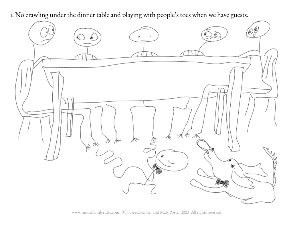 No crawling under the dinner table and playing with people’s toes when we have guests.