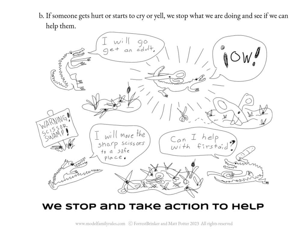 If someone gets hurt or starts to cry or yell, we stop what we are doing and see if we can help them. We stop and take action to help.